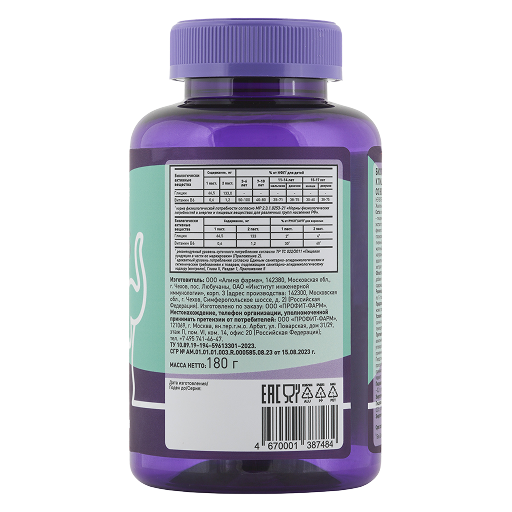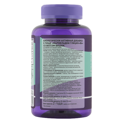 патока, сахар, вода, желатин, агент влагоудерживающий – глицерин, глицин, регулятор кислотности – лимонная кислота, экстракт травы мелиссы лекарственной, экстракт плодов фенхеля обыкновенного, экстракт цветков ромашки аптечной, глазирователь (содержит глазирователи: воск карнаубский, воск пчелиный белый, антиокислитель – альфа-токоферол), жир молочный, пиридоксина гидрохлорид; ароматизатор натуральный «Вишня» (содержит носитель – пропиленгликоль), краситель натуральный (глюкозно-фруктозный сироп, вода, экстракт черной моркови)